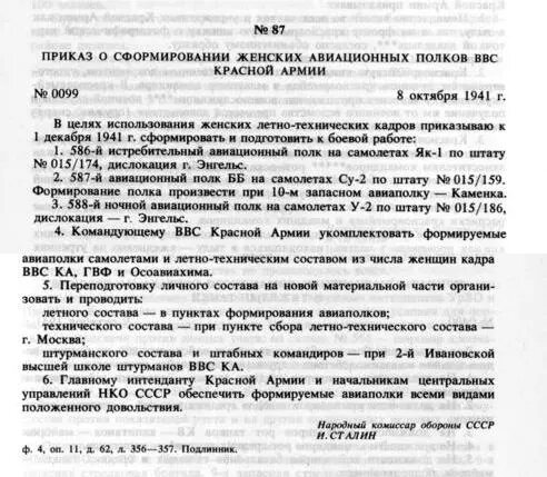 Так же, по приказу Народного Комиссара Обороны Союза ССР И.В.Сталина за № 0099 от 08.10.1941 «О сформировании женских авиационных полков ВВС Красной Армии», " ... Переподготовку личного состава на новой материальной части организовать и проводить: ... технического состава — при пункте сбора летно-технического состава — г. Москва«.
