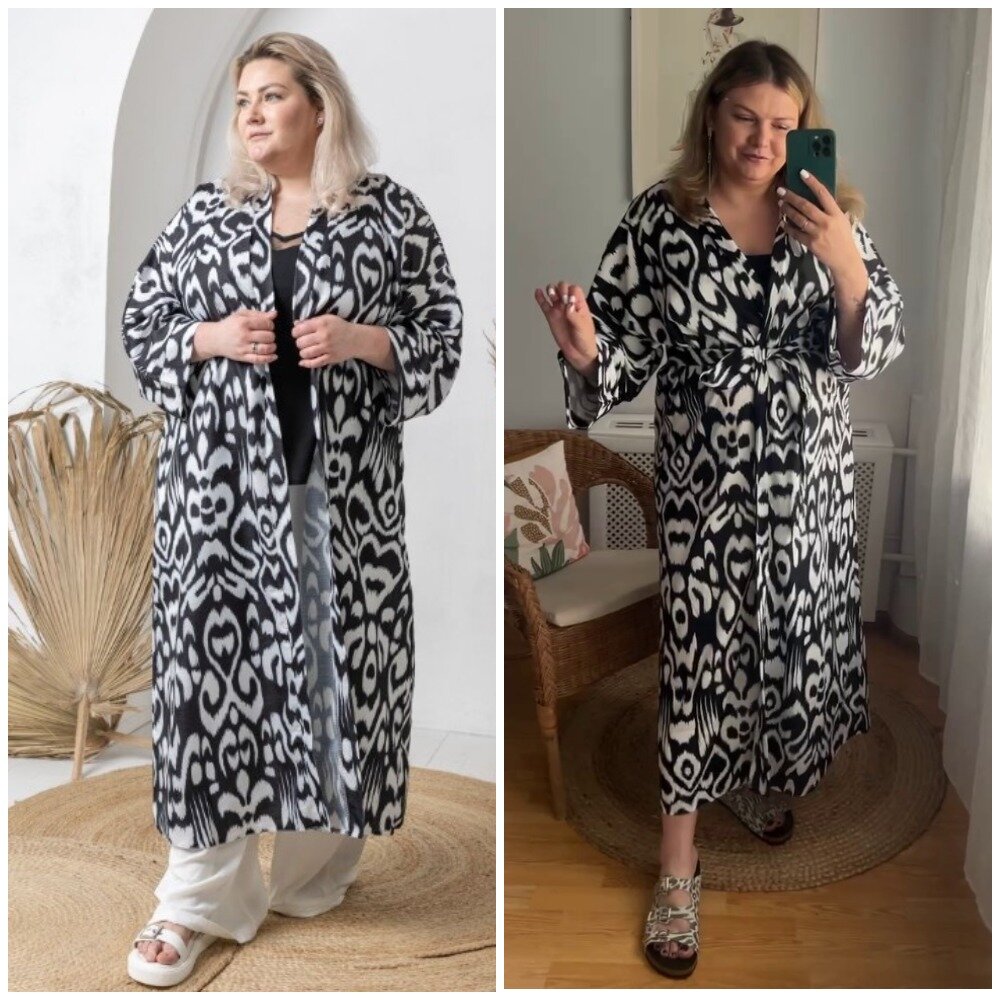 Здравствуйте, дорогие читатели! Меня зовут Марина, я - стилист PLUS SIZE, и на этом канале показываю одежду и аксессуары с Wildberries такими, как они есть, то есть, из серии "ожидание/реальность". Мои параметры: рост 170 см, вес 95 кг, 110-92-118 ✅Основной канал: Стилист PLUS SIZE Ставьте лайк в поддержку канала, и давайте смотреть на мою сегодняшнюю покупку. Очень универсальная вещь, от которого я просто в восторге, это вот такая накидка-кимоно. Так как в комплекте есть пояс, то ее можно надеть на пляж поверх купальника, но, в то же время, в расстегнутом виде она сможет стать частью ваших городских образов. Летом я предпочитаю носить такие кимоно с кроп-топами и брюками - не жарко и очень стильно. Черно-белый принт легко сочетать, можно выбрать яркие туфли, а можно - базовые. В общем, тут все зависит только от вашей фантазии, вещь супер-функциональная. Пусть вас не пугает п/э в составе - благодаря ему, накидка абсолютно не мнется, как это было бы со 100%-м льном или хлопком. Удобно б