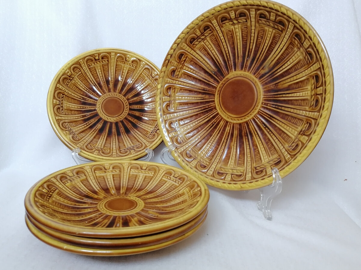 Набор посуды фаянсовый. Цвет коричневый, различных оттенков. А вот у мамы нашла пару тарелок, точно такой же формы, но белого цвета. Марка правда на этой тарелке в тесте. Это фаянс, абсолютно одинаковой формы, но вот воспринимаются они совершенно по-разному.