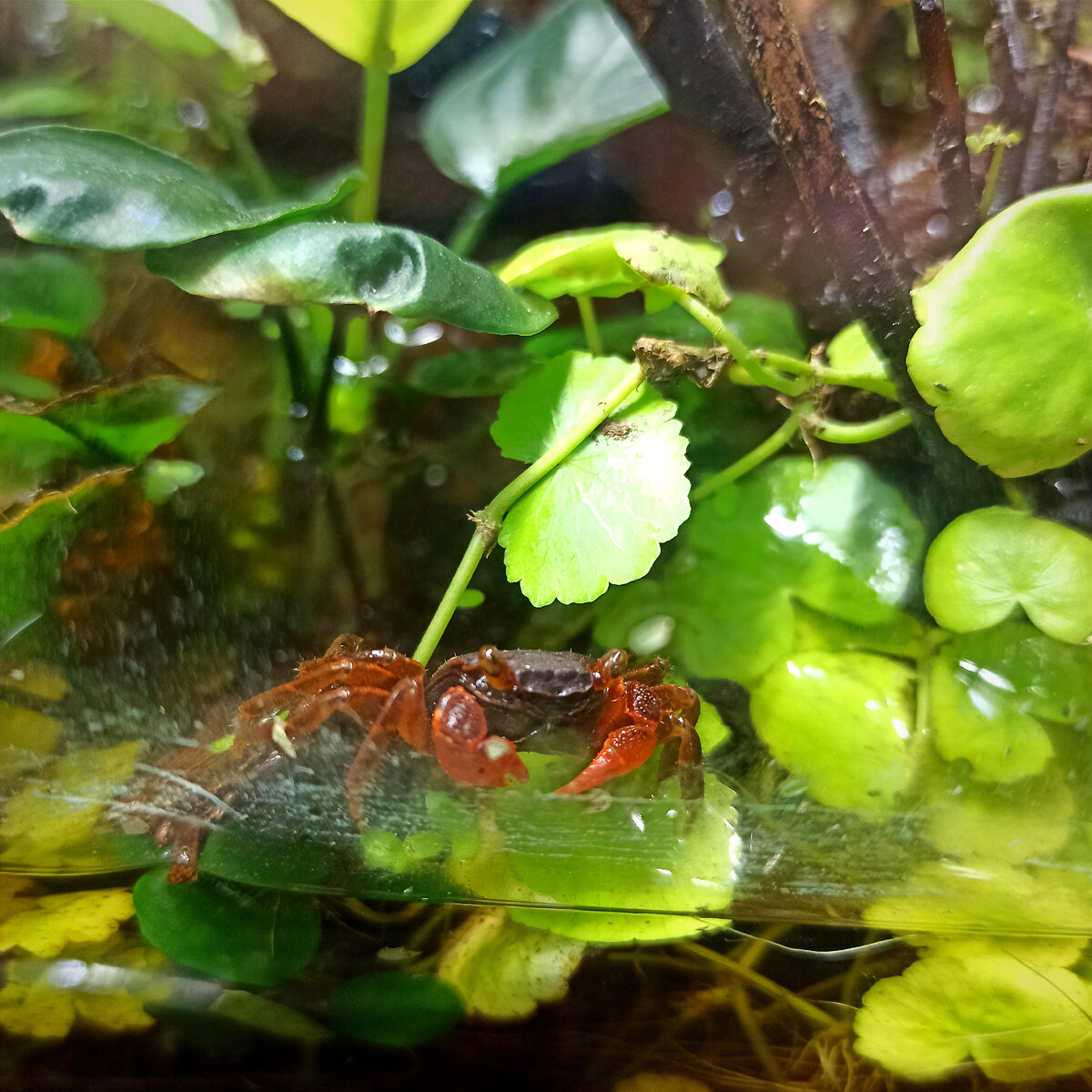 Всем привет! В сегодняшней публикации я расскажу как обстоят дела в моём домашнем уголке тропиков – в палюдариуме с крабами рода Geosesarma. К моему большому счастью продолжает раскрывать новые бутоны минисиннингия! Всё-таки яркий прекрасный цветок никогда не лишний. Три недели назад я высадила парочку крошечных кустиков садовой кислицы (оксалис) в этот палюдариум. Оксалис очень быстро прижился и начал расти! Даже на коряге, частично погруженной в воду, оксалис быстро прижился можно сказать без грунта: корешки лишь слегка были прикрыты щепоткой кокосового субстрата. Один из кустиков оксалиса почему-то заметно вытягивается, хотя освещение палюдариума, на мой взгляд, отличное. Есть у меня одно предположение, почему же всё-таки происходит вытягивание: свет в палюдариуме включается вместе со светом в аквариумах, а световой день всех моих «банок» как правило не более 8 часов, так что, вытягивание оксалиса может быть вызвано относительно коротким световым днём. По прошествии ещё какого-то вр