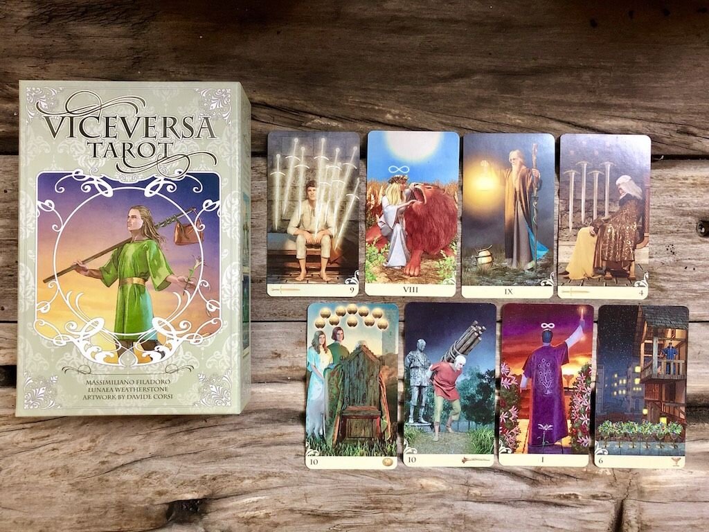 Особенность колоды "vice-versa" заключается в том, что у колоды нет рубашки: с обеих сторон карты изображения. Аркан — вид спереди и аркан — вид сзади. Точнее, с другой стороны. Это двустороннее прочтение Уэйта. Итого в этой колоде 78 карт и 56 изображений. «Уточнить», какая перед тобой сторона, если используешь колоду «на обе стороны», можно по расположению декоративного элемента: на лицевой стороне карты завитушка справа, на оборотной — слева.
