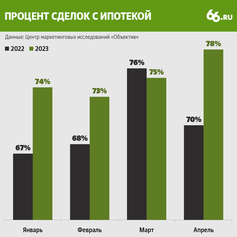 В апреле 2023 года процент сделок с ипотекой на рынке первичной недвижимости Екатеринбурга достиг 78%, такие данные приводит Центр маркетинговых исследований «Объектив». Это значит, что только 22% квартир купили без привлечения банковских кредитов. Для сравнения: в феврале этот показатель составлял 73%, а в январе–феврале 2022 года, до начала спецоперации, — 67–68%.