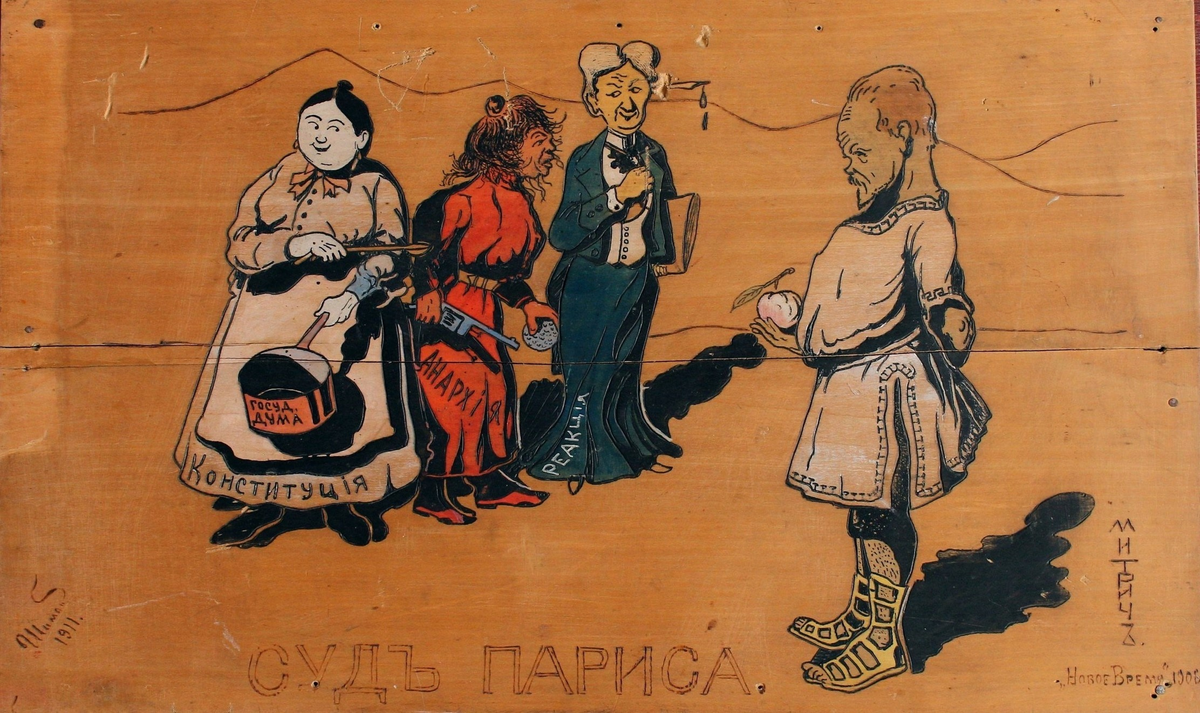 Отдельное место в коллекции Музея современной истории России занимает политическая карикатура. Особый интерес представляет деревянное панно «Суд Париса». Изображённая на нём карикатура была создана в 1906 г. и посвящена событиям Первой русской революции 1905-1907 годов. В 1911 г. рисунок перенесли на дерево.
