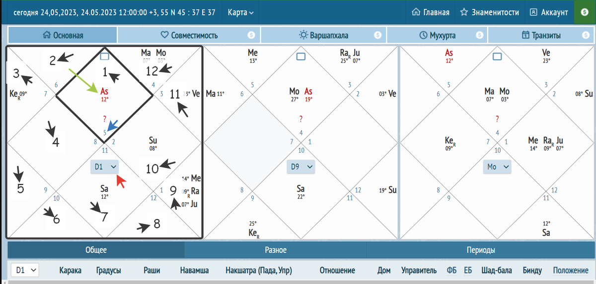Красной стрелкой я указал на то, что это за карта. В нашем случае это карта D1 или Раши, т.е. основная карта. Тут можно выбрать любую дробную карту. По умолчанию левый большой квадрат - это Раши (D1), по середине (D9) Навамша и справа (Mo) Лунная карта. Вся карта Раши выделена черным квадратом и внутри неё цифрами и черными стрелками я обозначил номера домов.