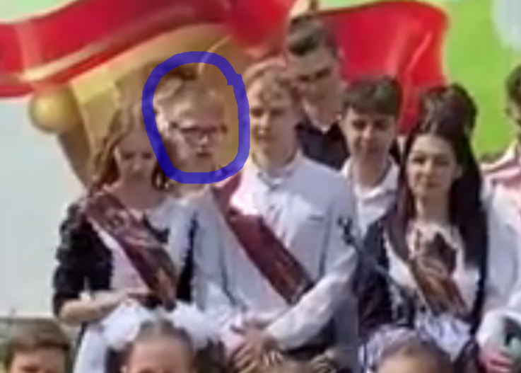 Кадр 1 Вот всё стоят на сцене вместе с одноклассниками и поют какую-то песню, ведь сейчас выпускной, вся деревня смотрит, внизу как положено младшеклассники. Крайняя слева стоит в первом ряду красивая девушка, позади неё её одноклассник в очках Песня завершается. Кадр второй: Посмотрев почему то 4 раза налево, этот очкастый парень деловито перехватывает правой рукой шею впереди стоящей девушки, та вначале не понимает в чём дело, смотрит тоже налево, а потом видимо видит периферийным зрением что у её шеи нож и кричит. Кадр третий: Парень слева от неё сразу же бросается на помощь и перехватывает руку преступника, девушка извернувшись, спускается вниз, пока руку кровавого маньяка держит одноклассник и выскальзывает из его полуобхвата, пройдя три шага она смотрит на происходящее с безопасного расстояния Кадр четвёртый Очкарик тщедушен, однако правой рукой душит парня, что держит его руку с ножом, здоровый парень в чёрной рубашке сзади прихватил шею преступника, второй парень в чёрной руба