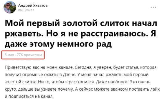 Приветствую вас на моем канале. Примерно две недели назад я написал статью, которая вызвала у моих читателей неподдельный интерес. Статья была о том, что я обнаружил на одном из моих золотых слитков ржавое пятно. Статья набрала аж 77 000 просмотров за эти две недели. Я этого не ожидал. Поэтому я никак не мог не продолжить эту тему. Тем более, что продолжение изначально предполагалось. Надо же от этой ржавчины избавиться. А прежде чем я перейду непосредственно к очистке слитка, разрешите мне представить один необычный канал, одного замечательного человека. Канал называется 5 снимков. В чем оригинальность этого канала лучше ее автора я наверное описать не смогу. Поэтому вот что он сам пишет: Меня зовут Дмитрий Абушкин. Этот дзен для тех, кому больше по душе смотреть, чем читать: каждый день по утрам я выкладываю фотосюжеты из пяти снимков, снятых мною на смартфон. Основные темы - Москва, города, транспорт, природа. Хотя темой может стать всё, из чего получилось сложить сюжет в 5 снимков