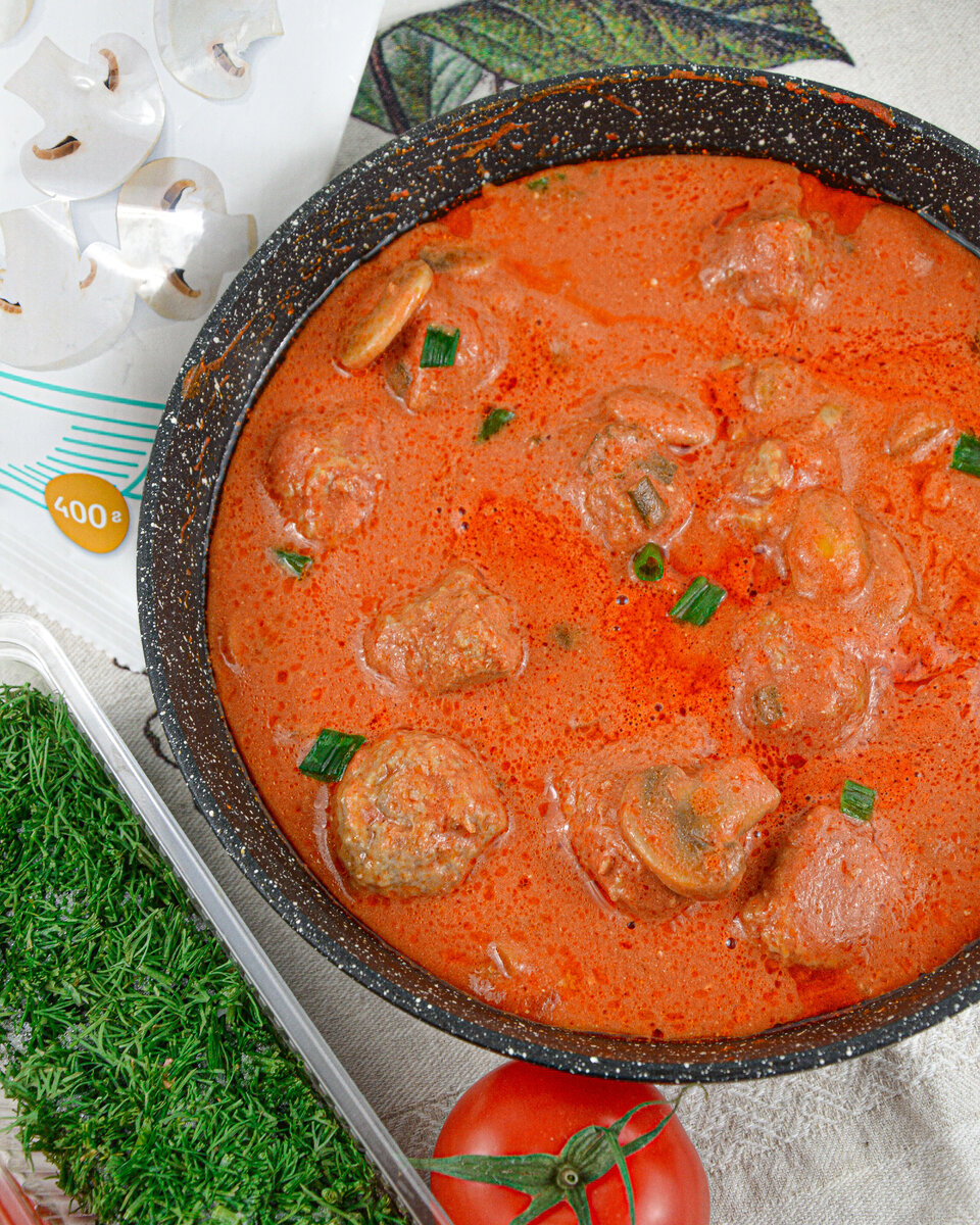 вылить в митболы , добавить шампиньоны, потушить ещё минут 10.