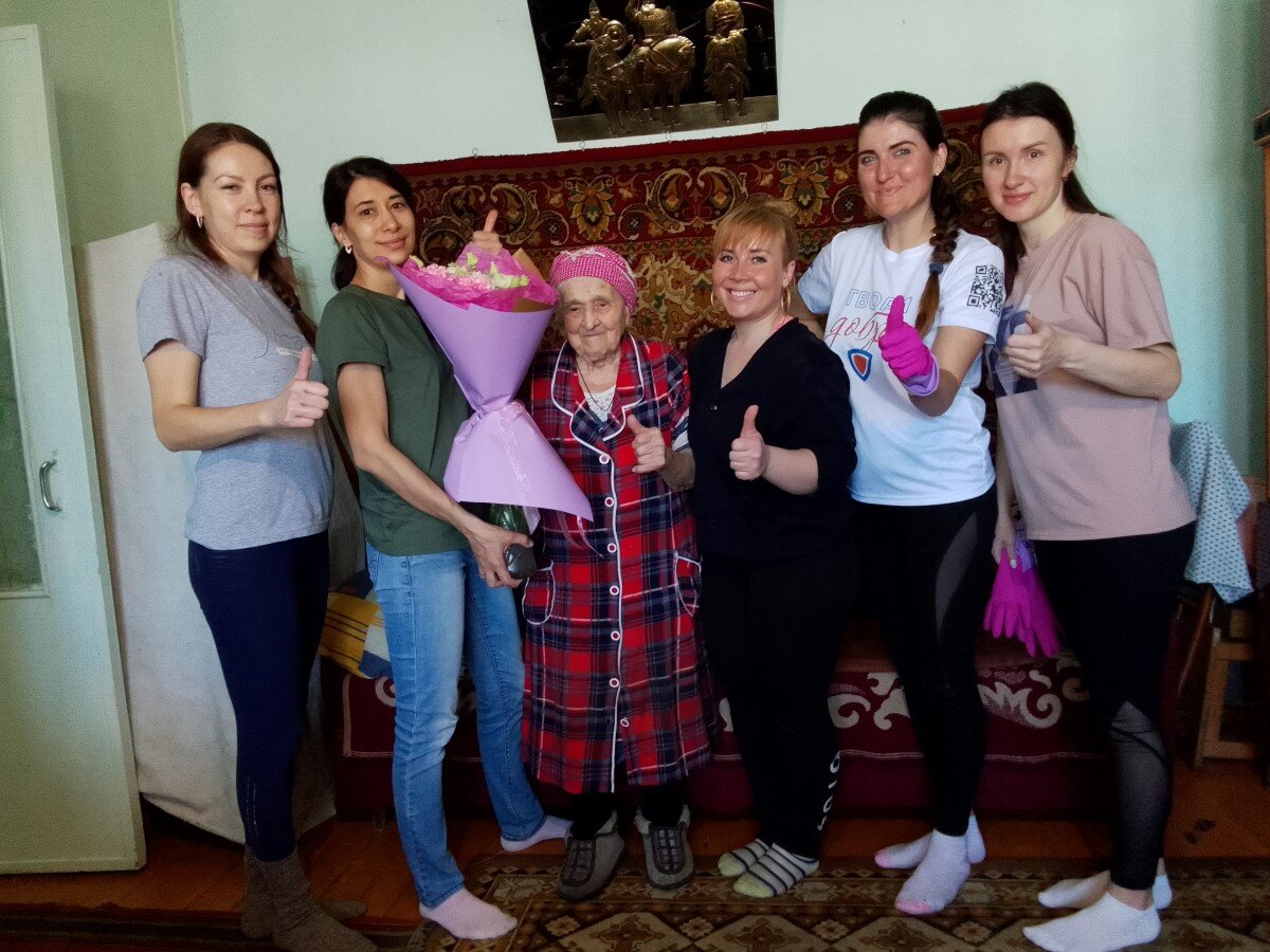 Больше 4 часов трудились девушки в доме бабушки-ветерана. Распаковали и довели до блеска все окна, почистили диван и ковры, привели в порядок шкафы, кухню и в завершении помыли полы.