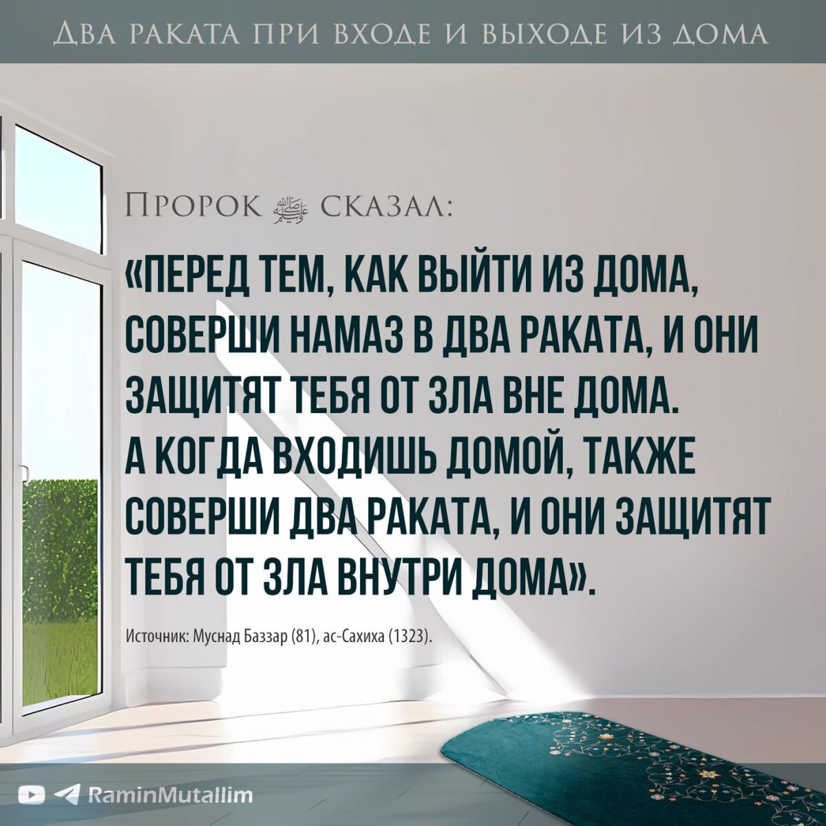 Два раката при входе и выходе из дома Пророк ﷺ сказал: «Перед тем, как выйти из дома, соверши намаз в два раката, и они защитят тебя от зла вне дома. А когда входишь домой, также соверши два раката, и они защитят тебя от зла внутри дома». Источник: Муснад Баззар (81), ас-Сахиха (1323). 🖋 Рамин Муталлим t.me/raminmutallim