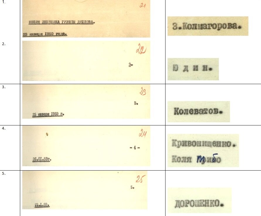 Имеющиеся в деле копии дневников, которые Юрий Яровой называет "Не дневники", представляют собой неиссякаемый материал для анализа. Впрочем, судите сами. Копии дневников в деле находятся на 10 листах № 21–30. То есть, по количеству участников похода. В приведенной ниже таблице разместила верхнюю часть каждого листа, а рядом - "автора", указанного на том листе: Первая запись "Копия дневника группы Дятлова" на 21 листе о событиях за 23 января, фамилия З. Колмагорова с ошибкой. Две последних записи "Копия дневника участницы похода З.Колмогоровой" на 29 и 30 листах - за 24 января. Обратим внимание на разную запись дат: лист № 21 23 января 1959 года (в документе также 24 января) лист № 22 даты нет лист № 23 25 января 1959 г. лист № 24 26.01.59г. лист № 25 27.1.59. лист № 26 28 января. лист № 27 30 января 1959 г. лист № 28 31 января 1959 г. лист № 29 24 января 1959 г. (в документе также 30 января) лист № 30 даты нет *) первая дата (23 января 1959 года) записана полностью, каждая последующа