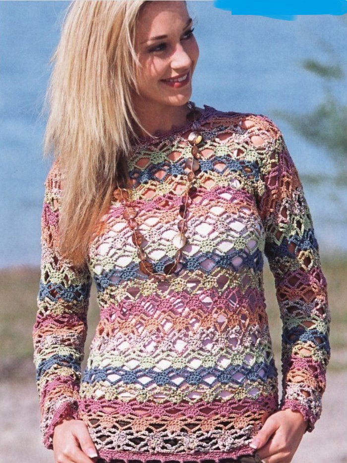 В этой подборке пуловеры ажурными узорами, связанные крючком. Они составят вам достойную компанию в летний день. 1. Первый "полосатик". Горизонтальные полоски узора и красивые оттенки пряжи использованы для вязания этого пуловера. Узор необыкновенно воздушный - ракушки на сеточке. 2. Чудесный бело-розовый пуловер. Насыщенный розовый в сочетании с белым, отделка шнурками и простой сетчатый узор делают этот пуловер ярким и запоминающимся. 3. Пуловер с коротким рукавом. В этом летнем пуловере голубого цвета горизонтальные широкие полоски образованы за счет мотивов основного узора. 4. Пуловер в стиле хиппи. Использована пряжа натуральных природных цветов и несколько видов сетчатого узора. 5. Бело-голубой пуловер. Сочетание белых и голубых вертикальных полос стройнит фигуру. Выкройка модели из простых прямоугольников упрощает процесс вязания. Всем добра и красивых летних вещей! Благодарю за просмотр и лайки👍👍👍! Выбирайте модели, сохраняйте понравившиеся статьи, делайте репосты на свои с