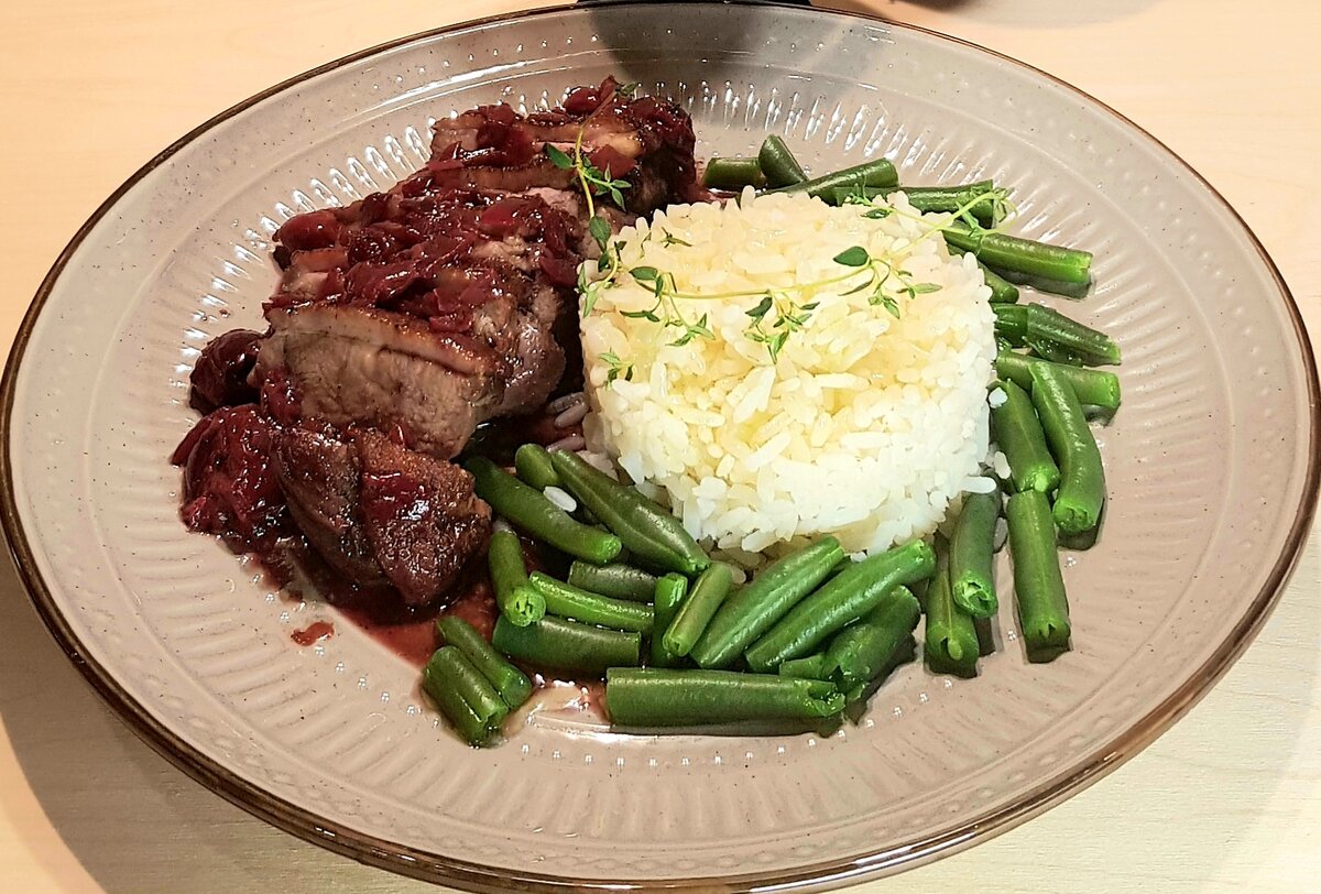 Не знаю чья это кухня, думаю что здесь все отметились и австро-венгры и французы и их ближайшие соседи. Рецептов в интернете много. Очень много. А у меня все просто. 1. Грудку маринуем в смеси любимых специй, я взяла перец и тимьян. 2. Обжариваем на сильном жаре до золотистой корочки с двух сторон. Откладываем. 3. В сотейник выкладываем мелко нашинкованный лук и тушим до прозрачности. 4. Добавляем сливочное масло и в эту лужицу корицу. Все восточные специи требуют сливочного масла, в нем они полностью раскрывают свой аромат. 5. Добавляем сахар можно тросниковый, для гурманов на выбор бренди, портвейн, коньяк, красное сухое вино🍷, выкладываем вишню и томим соус до готовности. 6. Можно заморочиться все пюрировать, потом протереть через сито. Я не морочусь. 7. Выкладываем в форму соус, на него грудку кожей вверх и снова соус и ставим помиться в духовку при 140 градусах на пол часика. Все. Важно❗Если вы запекали утку и у вас остался жир ни в коем случае и никогда не выбрасывайте ег