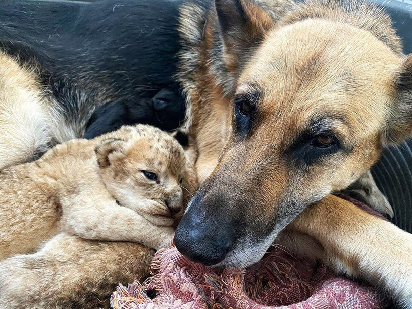 Необычный случай произошел во Владивостоке: немецкая овчарка заменила маму двум львятам