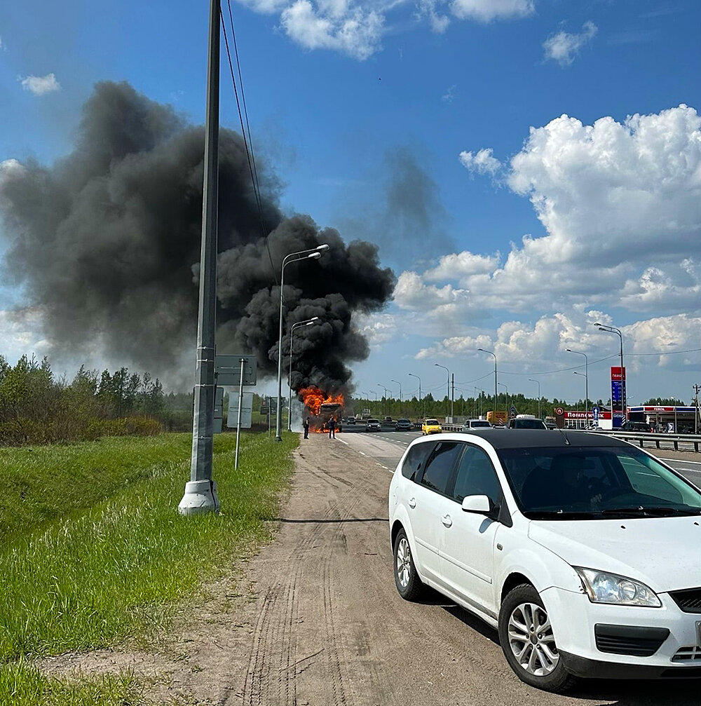Грузовик вспыхнул сегодня, 24 мая, на 25 километре автотрассы «Кола». Полыхавший большегруз тушили на федеральной трассе «Кола» во Всеволожском районе Ленобласти. Дымом заволокло проезжавшие мимо машины. Как рассказали 47news в ФКУ «Упрдор «Северо-Запад», около часа дня 24 мая поступило сообщение о грузовике, загоревшемся на 25-м километре федеральной трассы Р-21 «Кола». Дым от большегруза окутал автомобили, которые ехали в сторону Ленобласти. Возгорание ликвидировано прибывшими на место происшествия пожарными. По предварительным данным, пострадавших нет. В ГУ МЧС по Ленобласти уточнили, что горел самосвал Volvo. Сообщение о полыхающей машине поступило в 12:40. С огнем дежуржная смена 101-й пожарной части справилась к 13:15. Судя по фото и видео, опубликованным в соцсетях, машина остановилась на обочине, движение по участку трассы не затруднено. Обстоятельства случившегося уточняются. фото: © ДТП и ЧП | Санкт-Петербург | Питер Онлайн | СПб / ВК