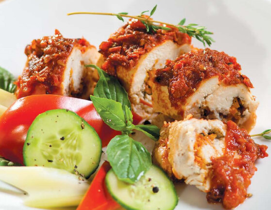 их томатной массой и запекайте 30 минут при 190 С. Во время запекания периодически поливайте томатным соусом. - При подаче удалите нитки или шпажки, выложите рулетики на тарелки