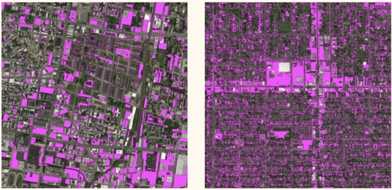 В 2018 году американские исследователи изучили пять городов, находящихся в разных штатах, и посмотрели, как они используют землю. Например, так. Слева Филадельфия, справа Сиэтл. Фиолетовым закрашены зоны парковки.