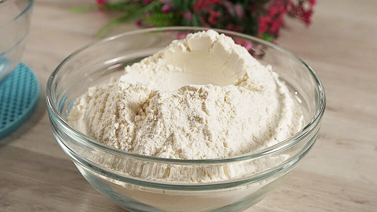 К муке добавляем сахар и дрожжи, все перемешиваем.