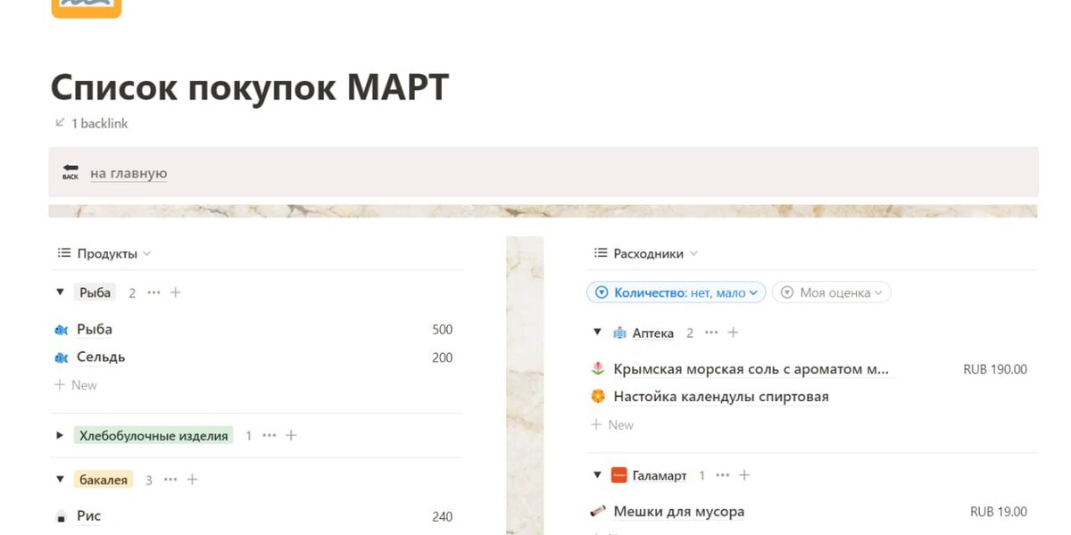 Notion - очень классный бесплатный инструмент абсолютно для всего, в том числе и для списка покупок. Он может помочь в разумном потреблении продуктов и не выйти за рамки бюджета. Например у меня есть отдельная страница для списка покупок, которая открывается как с компьютера, так и в мобильной версии приложения с телефона. Это очень удобно, когда ты стоишь в магазине, можно смотреть по отделам что необходимо, и складывать все в корзинку не приобретая лишнего.
