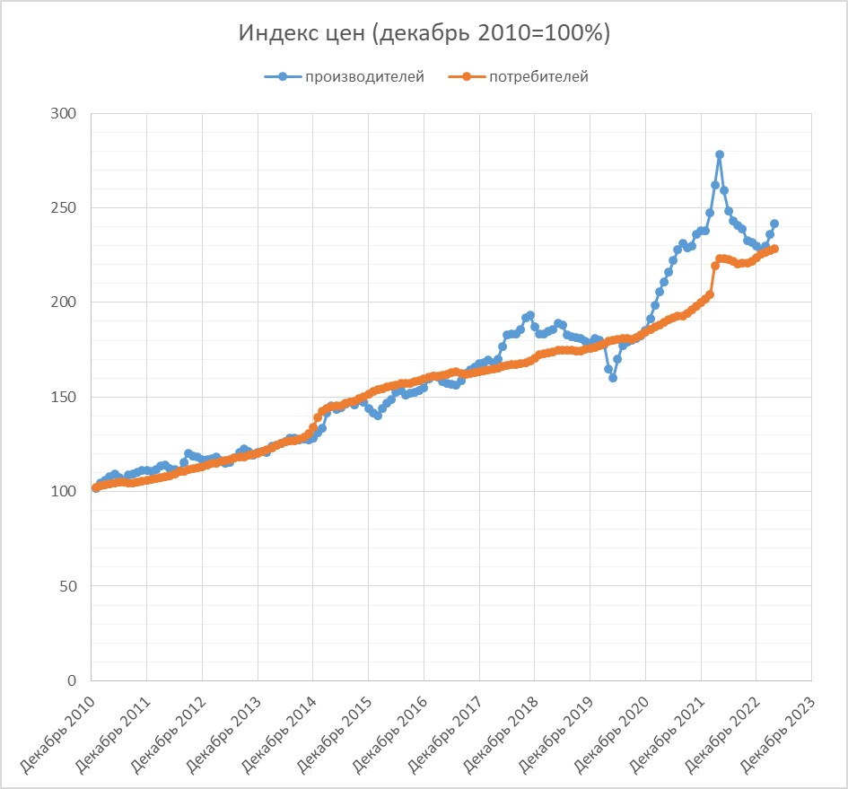 Продолжаю мониторить этот показатель, т.к. больше мало кто это делает. В апреле он составил чуть меньше мартовского - +2,4% против +2,6%. Это тем не менее существенно выше, чем индекс потребительских цен (+0,38% в апреле, +0,37% в марте). Благодаря этому снова растёт разрыв между ними. Посмотрим, как он будет компенсироваться в будущем, в 2022-м это произошло благодаря дефляции цен производителей. Собственно, её мы и видим на графике динамики цен за год (как и падение потребительской инфляции) - ещё и за счёт того, что в скользящий год перестали попадать самые инфляционные месяцы 2022-го: февраль-апрель. Ну, и скриншот роста цен по отраслям. Сильнее всего он в добыче, но до этого там и падение было сильнее всего, и оно всё ещё сохраняется, если смотреть на индекс к прошлому апрелю (судя по металлургии, нефтехиму и бумаге - эх, жаль, деревообработки тут нет для полноты картины - это в целом тенденция для попавших под санкции отраслей).