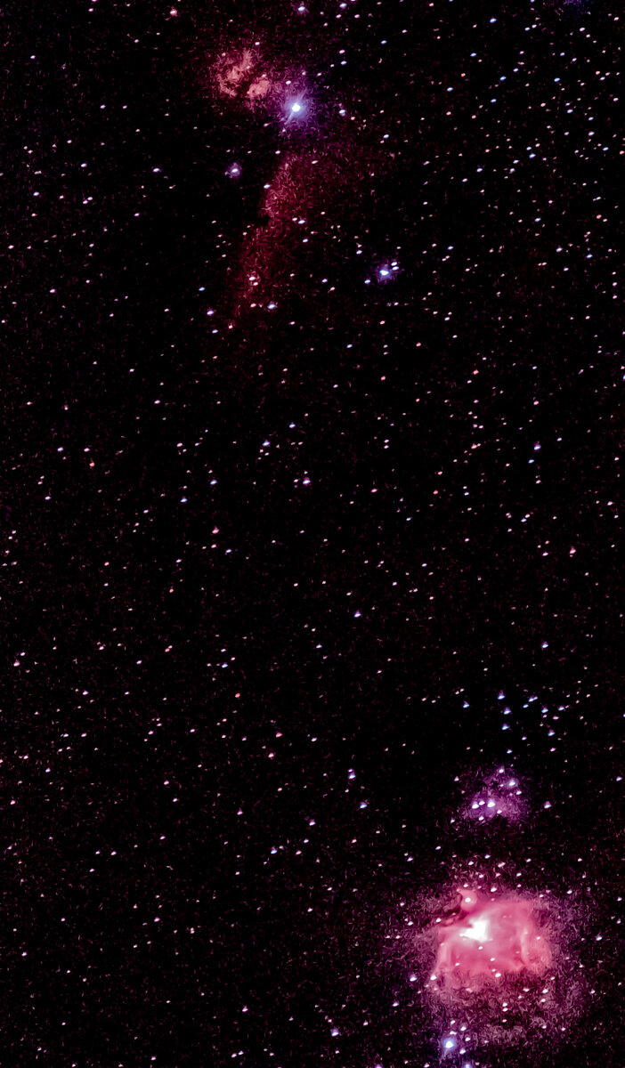 Комплекс интересных объектов пояса и меча Ориона. Сверху вниз: Туманность пламя- находится в трех тысячах световых лет от нас. Свечение обусловлено большим количеством молодых звёзд, которые постоянно рождаются в данном регионе. В центре видна тёмная пылевая структура, заслоняющая свечение. Тут же Звезда Альнитак (в переводе с арабского означает "Кушак" две других звезды астеризма "Пояс Ориона" Альнилам и Минтака в кадр не попали. Альнитак находится на расстоянии около 817 св. лет. Это тройная звезда. Главная звезда — горячий голубой сверхгигант пятой абсолютной величины. У неё есть два голубоватых спутника 4 и 10 величин. Эти звёзды являются членами ассоциации Орион OB1 Туманность "Конская голова". — одна из наиболее известных туманностей. Она видна как тёмное пятно в форме конской головы на фоне красного свечения. Это свечение объясняется ионизацией водородных облаков, находящихся за туманностью, под действием излучения от ближайшей яркой звезды Альнитак. Тёмный фон туманности во