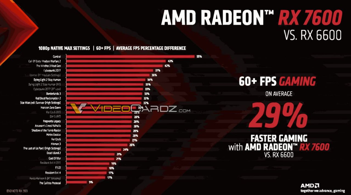 За такую цену предлагают разрешение 1080p с частотой кадров 60 FPS. Это самая дешевая видеокарта в линейке Radeon RX 7000 и даже дешевле на 60 долларов, чем RX 6600.