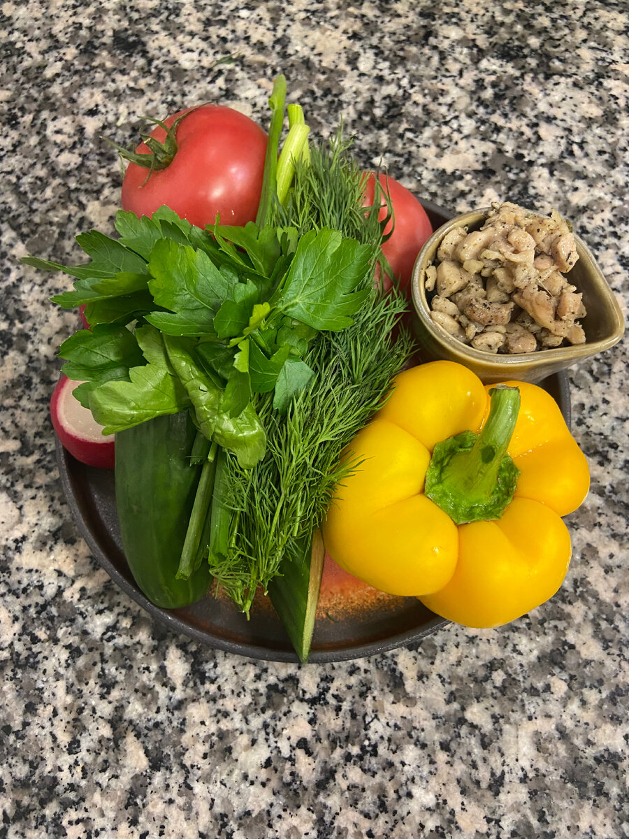 Идея этого легкого салата возникла вместе с тренировками моего товарища. Он сбрасывал вес и сидел в основном на овощах. Но мужское сердце хищника всегда просит мясо😈 Мы начали мариновать немного мяса курицы, обжаривать его и добавлять в овощной салат. Состав Нарезаем наши ингредиенты кубиком. Шинкуем зелень, добавляем приправы и курицу, овощи. Перемешиваем с маслом и подаем довольному другу😎 Легкий, очень быстрый и вкусный салат.