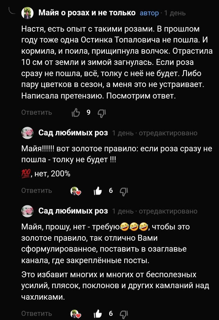Друзья, нужно знать свои права и будет вам счастье! Решила я в конце концов раз в жизни воспользоваться своим "блогерством " и получить возмещение убытков за некачественные саженцы. Итак, розы были куплены в Подворье. Обзор развития роз в этом видео. Несколько интересных и полезных комментариев Публикую переписку с интернет-магазином Подворье. "Добрый день! Два саженца из данного заказа оказались с повреждением коры и прекратили своё развитие. 1. Роза Роткепхен изначально была слабой и с больными побегами. На левом побеге хорошо виден разрыв коры. Вы сделали мне за неё скидку 50 процентов. Но саженец дал несколько слепых побегов и прекратил свой рост. 2. Роза Ла Вилла Котта была изначально с чёрными пятнами на побегах. Мне объяснили это механическими повреждениями. Но побег также не развивается, из верхней почки вырос слабый слепой побег. Опыт выращивания роз 30 лет. Веду свой канал на Дзене "Майя о розах и не только ". Покупка роз и внешний вид саженцев зафиксирован в статье. h