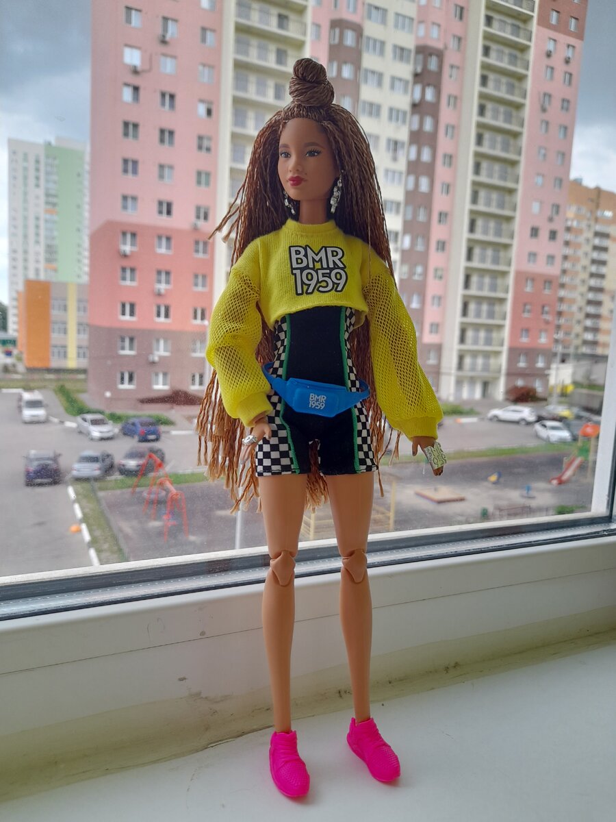 Одета в розовые кроссовки, очень детализированные. Черно-белый, в шахматный рисунок, спортивный комбинезон с зелеными строчками и черной вставкой спереди. Сверху на комбинезон одета желтая кофта с сетчатыми рукавами и белой надписью BMR 1959. В ушах красивые сережки. На ручках с идеальным маникюром (лак зеленого цвета) - два колечка, одно широкое, тоже BMR 1959, второе поменьше, серебрянное. Модница. Может потом, когда сама захочет, свяжу или сошью ей вечернее платье. На замену спортивного образа. Но пока нам и так хорошо.