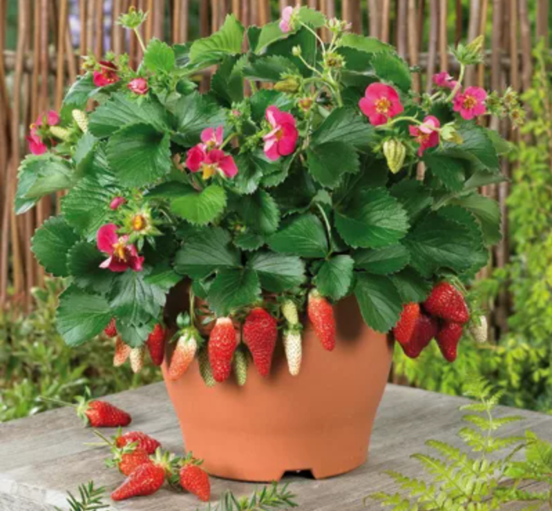 🍓 Тоскана. Невысокое растение до 15 см с темно-зелеными блестящими листьями. Куст пышный, в период цветения покрывается цветками с темно-розовыми лепестками. Ягоды некрупные, имеют конусообразную форму и приятный вкус. Размножается усами, которых образуется очень много. Отлично подходит для выращивания в кашпо или подвесных контейнерах из-за длительного и обильного цветения.