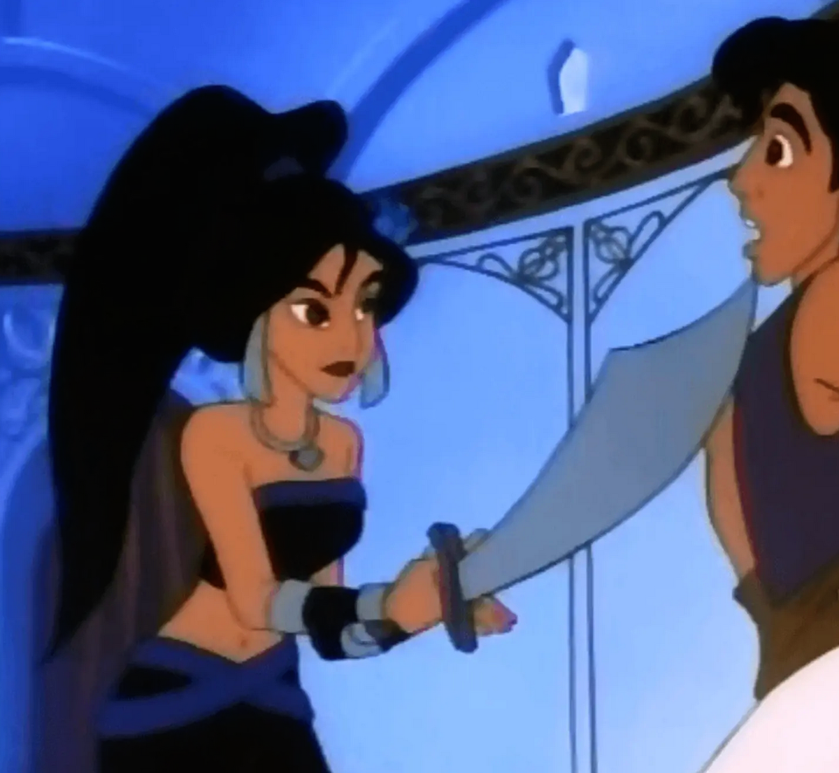 Осторожнее, странник, впереди земли спойлеров Жасмин Своенравная принцесса Аграбы и в обычной ипостаси не позволит себя обидеть. Периодически спасает от гибели своего любимого Аладдина, да о подданных государства при этом не забывает. Но в своей тёмной версии она начинает пугать всех: от Султана и дворцовой стражи до Аладдина и команды. Плеть Пустыни — вот как стала называть себя Жасмин после того как потеряла память из-за магии волшебной голубой розы. Её беспамятством воспользовался лидер шайки разбойников Абис Мал, представившись отцом принцессы, и попросив захватить ему трон. Она крайне быстро одолела всю стражу, захватила дворец и кинула в темницу всех несогласных с её властью, включая и самого Абис Мала (ведь трон только один). Если бы не любовь к Аладдину и последующее разрушение чар потери памяти, кто знает, чтобы было с Аграбой дальше. Увидеть такую Жасмин Вы можете в эпизоде «Forget Me Lots / Роза забвения» мультсериала "Аладдин" 1994-95 года. Рапунцель Этот мастер сковородок