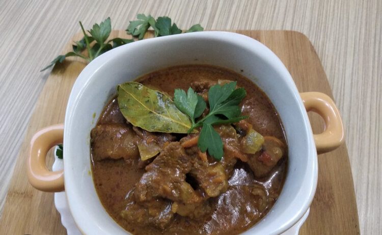 Ингредиенты: - 500 г говядины - 2 луковицы - 2 зубчика чеснока - 2 столовые ложки томатной пасты - 1 столовая ложка паприки - 1 столовая ложка муки - 2 столовые ложки растительного масла - соль и перец по вкусу Приготовление: 1. Нарежьте говядину на кусочки. 2. Очистите лук и чеснок, нарежьте их мелко. 3. Разогрейте растительное масло в кастрюле и обжарьте говядину до золотистой корочки. 4. Добавьте лук и чеснок, жарьте еще 2-3 минуты до мягкости лука. 5. Посыпьте муку на кастрюлю и перемешайте, чтобы покрыть все ингредиенты. 6. Добавьте томатную пасту, паприку, соль и перец, перемешайте. 7. Залейте кипятком так, чтобы он покрыл все ингредиенты, и доведите до кипения. 8. Уменьшите огонь и готовьте на медленном огне до тех пор, пока говядина не станет мягкой (около 1,5-2 часов). 9. Периодически помешивайте и добавляйте кипяток по мере необходимости. 10. Готовый гуляш подавайте горячим с гарниром из картофеля или риса.