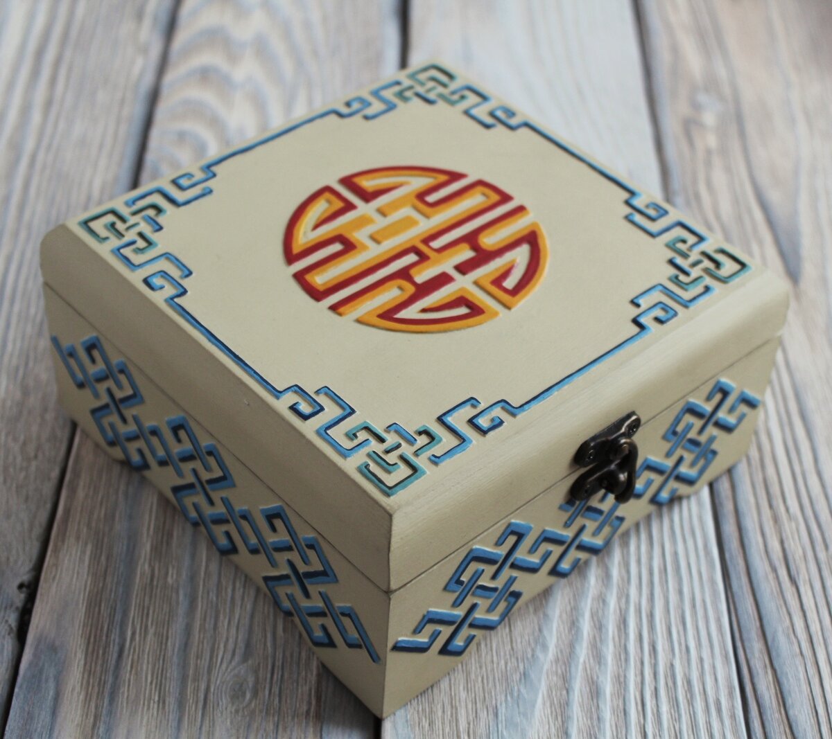 Шкатулка в национальном стиле. Цвет слоновая кость, ручная роспись рельефа, замочек под бронзу