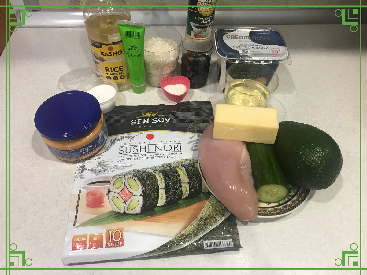 Представляю вам еще одно блюдо по мотивам японской кухни. Приготовление совсем не сложное, а в итоге вы получите аппетитные запеченные роллы, которые порадуют вас своим насыщенным вкусом. Побежали на кухню. Для приготовления я взяла: 1. Рис промыла, залила водой так, чтобы она покрывала его на два пальца. Довела до кипения и варила примерно 15 минут. Рисовый уксус смешала с солью и сахаром. Немного прогрела в микроволновке, перемешала чтобы крупинки полностью растворились. Эту смесь добавила в горячий рис, аккуратно перемешала и оставила немного остыть. 2. Пока занялась начинкой. Куриное филе помыла и нарезала на полоски. Выложила в сковороду с растительным маслом, немного посолила и обжарила до золотистой корочки. 3. Огурец и авокадо помыла. С авокадо сняла кожуру. Нарезала их полосками. 4. Коврик обернула пищевой пленкой, Положил лист нори глянцевой стороной вниз. Выложила половину риса ровным слоем, оставляя верхний край незаполненным. 5. Ближе к середине рисового слоя выложила