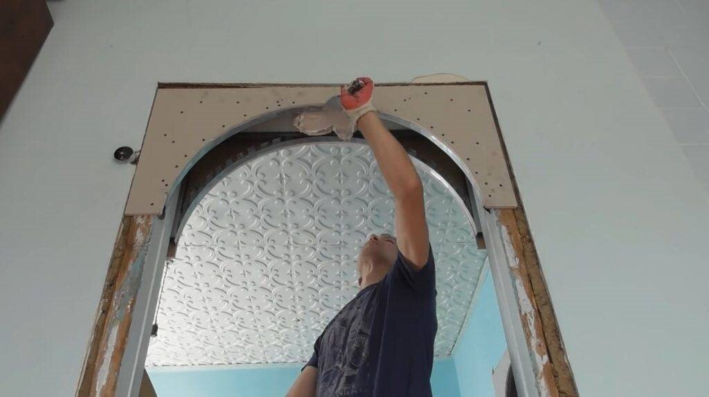 Гипсокартон можно использовать для обшивки как металлического, так и деревянного каркаса, и он легко крепится на любую поверхность. Для декорирования проёма нужно вырезать листы и закрепить их на саморезы. Швы между элементами следует замазать шпаклевкой и затем покрыть декоративной штукатуркой или краской.