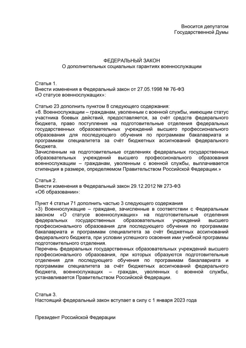 Спикер Госдумы Вячеслав Володин обратился к премьер-министру России Михаилу Мишустину с предложением законодательно обеспечить льготное поступление в вузы участникам спецоперации, прием без экзаменов в медицинские вузы детям врачей, погибших от COVID. “Председатель Государственной Думы Вячеслав Володин обратился к председателю правительства РФ Михаилу Мишустину с предложением законодательно обеспечить льготное поступление в вузы участникам СВО, а также прием без экзаменов в медицинские вузы детям врачей, погибших от ковида”, – рассказали в пресс-службе. Первый замруководителя фракции “Справедливая Россия – За правду” Олег Нилов неоднократно выступал с законодательными инициативами для помощи участников СВО и ветеранов боевых действий. Он подготовил законопроект, согласно которому предлагается гарантировать участникам боевых действий право на бесплатный курс подготовительного отделения и при получении удовлетворительных оценок – автоматом зачислять на бюджетные места в вузы. “Мною с кол
