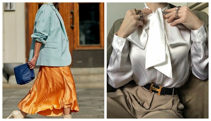 Женский гардероб всегда должен быть разнообразным, только при этом условии будут получаться шикарные образы на каждый день и не только. Прямо сейчас мы покажем на конкретных примерах, на какие атласные вещи следует обратить свое внимание современным модницам. Макси вечернее платье на тонких бретельках с глубокими декольте и высоким разрезом — наряд, который лучше всего носить с тонкими многослойными цепочками и сумками из жемчуга. Идеальным вечерним нарядом для каждой современной модницы станет атласное макси платье в викторианском стиле. Атласное платье в бельевом стиле — это тренд, который уже не первый сезон занимает лидирующие позиции. Летом этот наряд будет смотреться уместно, как в курортных, так и городских аутфитах. Также стилисты советуют обратить внимание в этом году на ультрамодные миди и макси юбки из атласа в пастельных оттенках. Эту шикарную базу можно комбинировать с лонгсливами, водолазками, рубашками и даже оверсайз вязаными свитерами. В качестве обуви к атласным элега