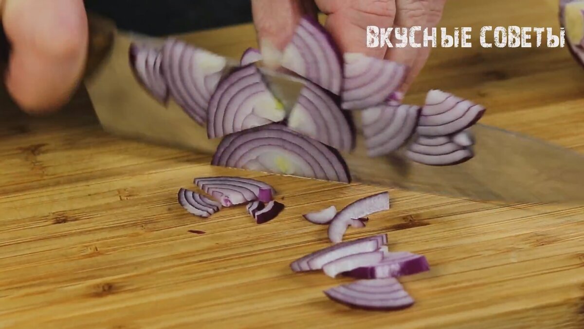 Из миски с луком сливаем маринад. Добавляем лук в салат.