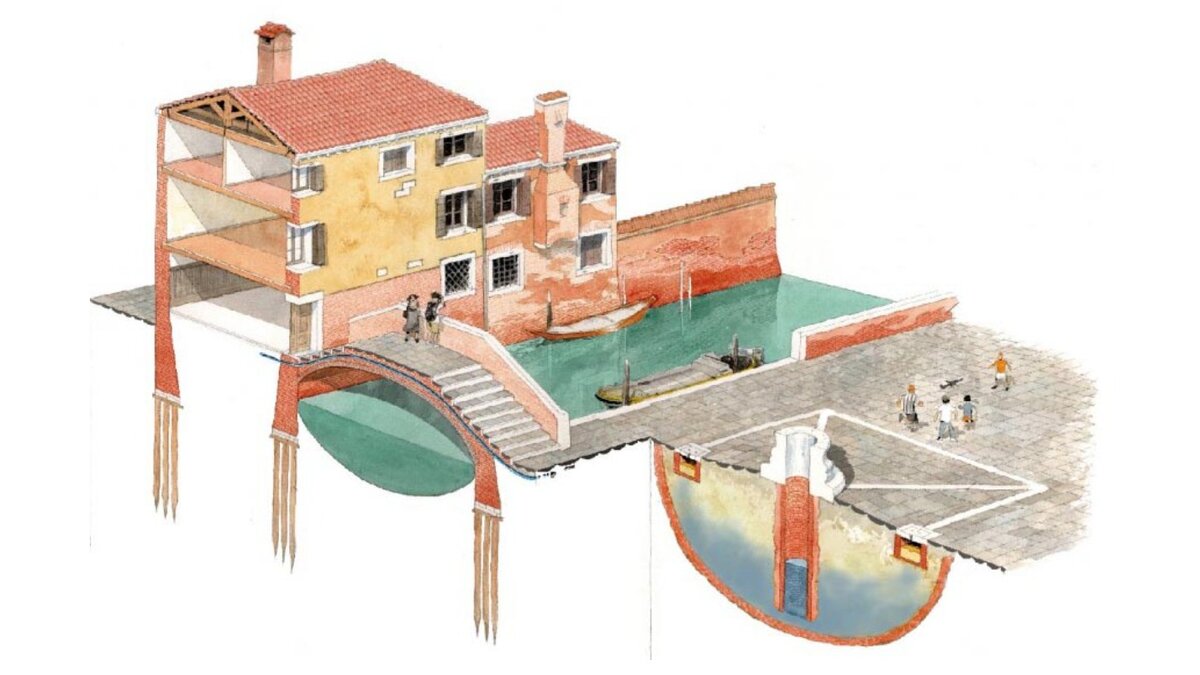 Венеция была построена на болотистых островах. Земля требовала укрепления, чтобы здания не утонули в топкой грязи. Для прочного фундамента нужны были сваи и дренаж. Сваями стали длинные заостренные стволы деревьев: дуба, лиственницы, сосны, ольхи, вяза и ели. Столбы вбивали до слоя плотной глинистой почвы. Иногда их ставили только по периметру здания, чтобы удерживать его стены, т.е. большую часть веса. Но, если здание было слишком тяжелым или столбы не достигали глинистого слоя, деревья плотно “высаживали” по всей площади, начиная с периметра и продвигаясь по спирали к центру. На вбитые сваи стелили 2 слоя толстых досок перпендикулярно друг другу. На деревянный настил укладывали дренаж из истрийского камня с одноименного полуострова на хорватской стороне, напротив Венеции. Высота этого слоя — между деревянными сваями и кирпичной кладкой — достигала среднего уровня прилива. Таким образом, каменные блоки все время находились в контакте с соленой водой и воздухом, но не подвергались изме