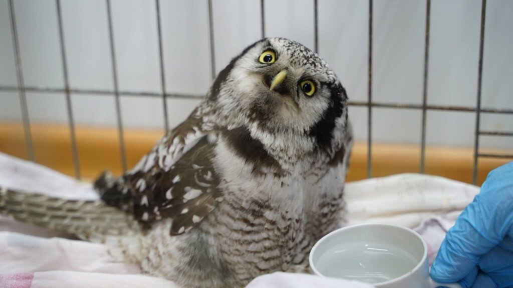 Совенок пьёт воду. На обед ему предложат куриные сердечки. После того, как хищник окрепнет, его выпустят на свободу подальше от населённого пункта.