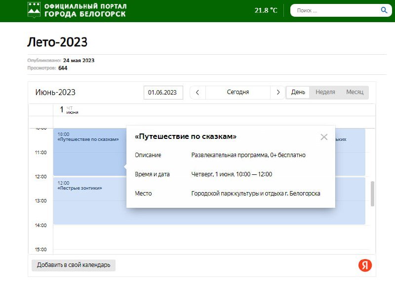 С 1 июня в Белогорске вновь заработает интерактивный календарь мероприятий культурной, образовательной и спортивной направленности на время летних каникул. Спецраздел «Отдыхайте! Лето - 2023» уже размещен на главной странице белогорск.рф. - Информационный блок администрации города во взаимодействии с учреждениями соцблока создают единую базу, где будут сведены в одном месте все мероприятия, соревнования, мастер-классы, концерты как в очном формате, так и онлайн, — рассказала специалист IT-отдела Юлия Дубовая. — За основу еще в 2022 году был взят сервис Яндекса для планирования. Теперь он преобразовался в общегородской канал информирования, который позволит каждому ребенку и родителю узнать через свой гаджет, что интересного подготовили учреждения культуры, образования, спорта в конкретный день. При планировании культурного и полезного отдыха достаточно будет лишь выбрать интересующую дату и кликнуть по мероприятию того или иного учреждения. Вся информация с местом, временем, датами про