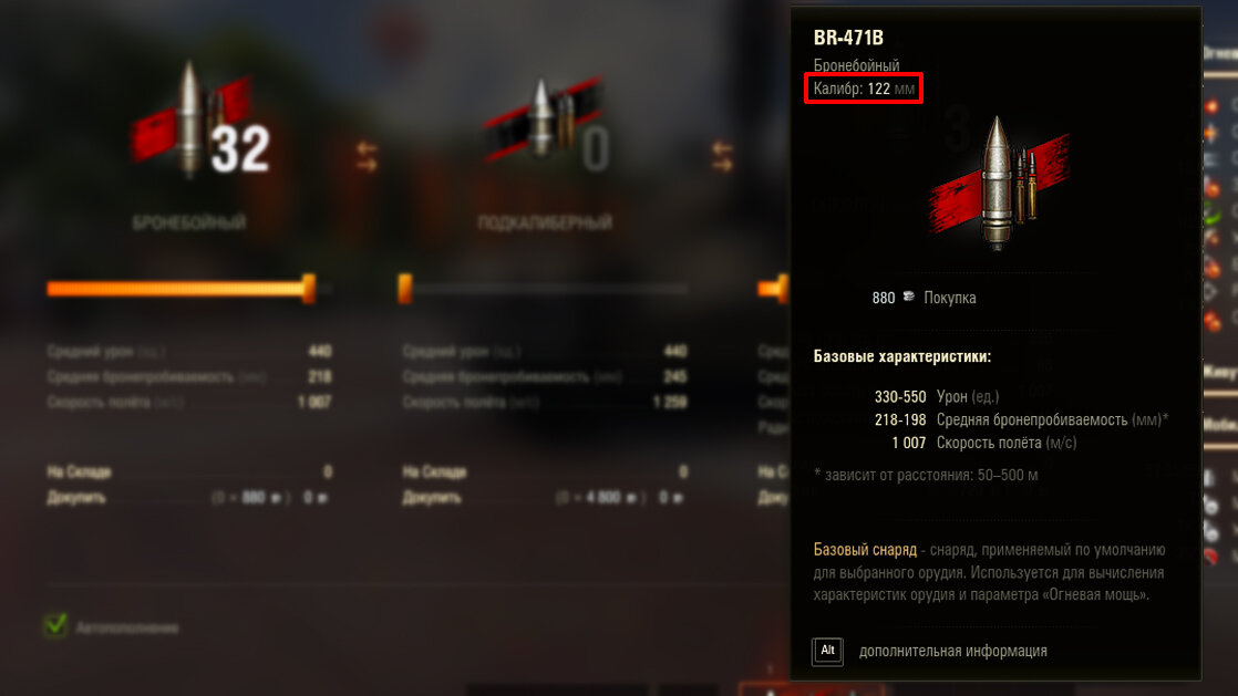 В разделе снарядов под каждым вашим танком указан калибр его орудия. Наверняка, многие даже не обращали внимания на эти цифры. А зря, ведь они имеют практическое применение в бою, и опытные игроки, выбирая танк для тех или иных задач, обязательно посмотрят на его калибр, и вот почему. Пять вещей, которые зависят от вашего калибра (и где это применять). 1. Урон по модулям. У каждого модуля есть свой запас прочности, и чтобы повредить боеукладку, баки, нужно нанести по ним определенное количество урона. И этот "урон" определяется не альфой танка, как многие считают, а калибром орудия. Примерно так: калибр Caernarvon - 94 мм, 94 умножаем на 1,3 = 122 единицы урона по модулям (как обычно, плюс-минус 25%). А топливные баки ИС-3 имеют 175 прочности, потому с одного выстрела Каен его никак не подожжет, а вот какой-нибудь ИС-7 с калибром 130 мм и уроном по модулю 170 - запросто. Потому, кстати, важно чинить желтые баки, ведь они потеряли половину прочности, а значит даже мелкие калибры с очен