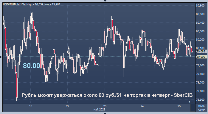 Рубль может удержаться около 80 руб./$1 на торгах в четверг - SberCIB Курс доллар/рубля на Мосбирже интервалами в 1 минуту Курс доллар/рубля на Forex интервалами в 4 часа Рубль может удержаться около 80 руб./$1 на торгах в четверг - SberCIB Котировки доллара к рублю останутся около уровня в 80 руб./$1 в течение торговой сессии в четверг, полагают аналитики SberCIB Investment Research. "Минфин в среду на аукционах ОФЗ сохранил консервативную тактику и вновь не предоставил заметных премий, разместив бумаги на 64 млрд руб. Тем временем недельная инфляция в России осталась низкой (0,04%, как и неделей ранее). В этих условиях доходности в четверг могут снизиться на несколько базисных пунктов или будут стабильными. Рынок, скорее всего, проигнорирует новость о повышении инфляционных ожиданий населения в мае, так как оно было незначительным", - отмечают в комментарии эксперты инвестбанка. Цены на нефть марки Brent могут закрепиться в диапазоне $78-79 за баррель на торгах в четверг, полагают в