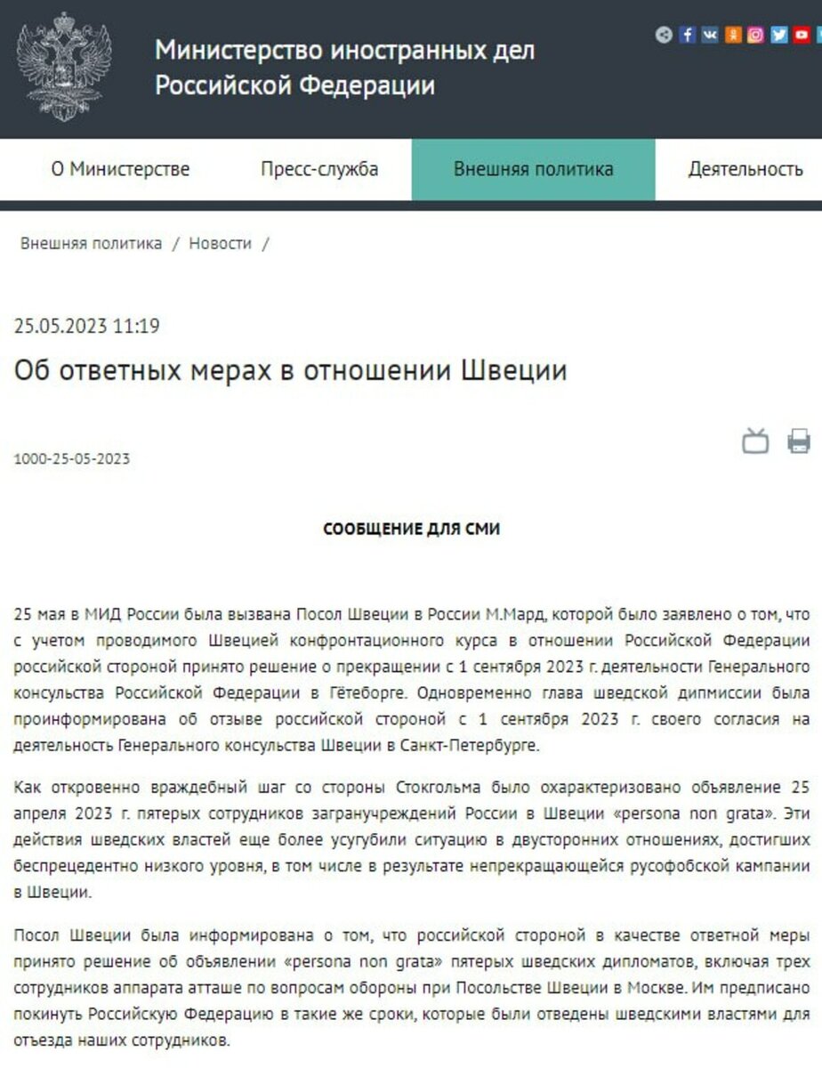 Пятеро дипломатов страны объявлены в России персонами нон грата. В МИД сообщили, что 25 мая в ведомства была вызвана посол Швеции в России, которой заявили о том, что с учетом проводимого страной конфронтационного курса в отношении РФ принято решение о прекращении с сентября 2023 года деятельности Генконсульства РФ в Гетеборге. Также в Петербурге закроют Генконсульство скандинавской страны. Кроме того, пятерых дипломатов, включая трех сотрудников аппарата атташе по вопросам обороны при Посольстве Швеции в Москве, объявили персонами нон грата. Причиной стал откровенно враждебный шаг со стороны Стокгольма – государство объявило пятерых сотрудников загранучреждений России в Швеции персонами нон грата. Теперь иностранным дипломатам нужно покинуть РФ в те же сроки, которые были отведены шведскими властями для отъезда наших сотрудников. Ранее Readovka сообщала о том, что Россия в ответ на санкции закрыла въезд 500 гражданам США.