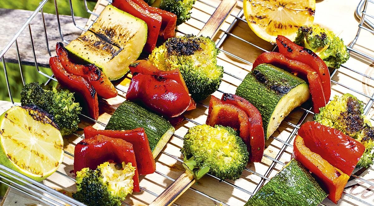 Овощной шашлык из брокколи, сладкого перца и цуккини, приготовленных на мангале, подойдет и вегетарианцам, и мясоедам