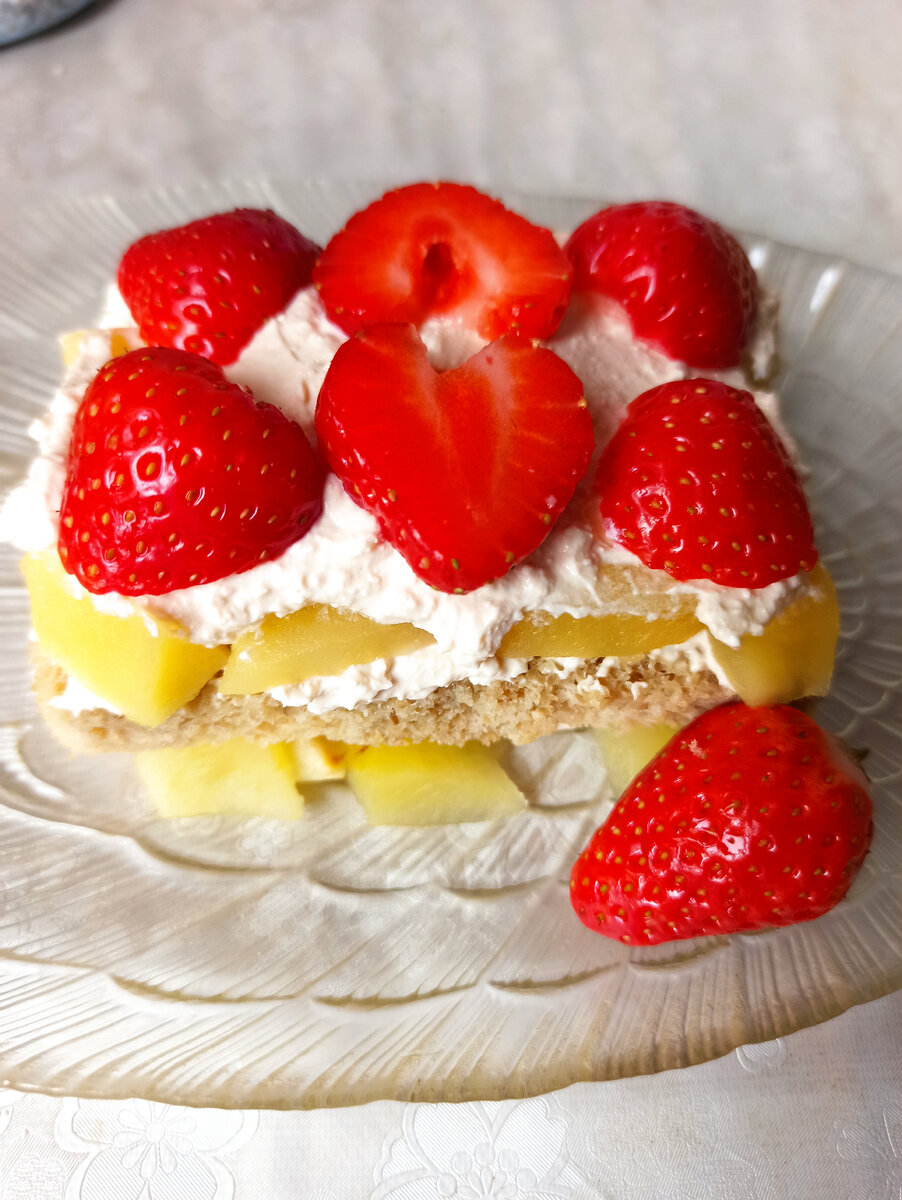 Кусочки лучше нарезать одинаковыми по размеру - легче будет собирать в пироженое.