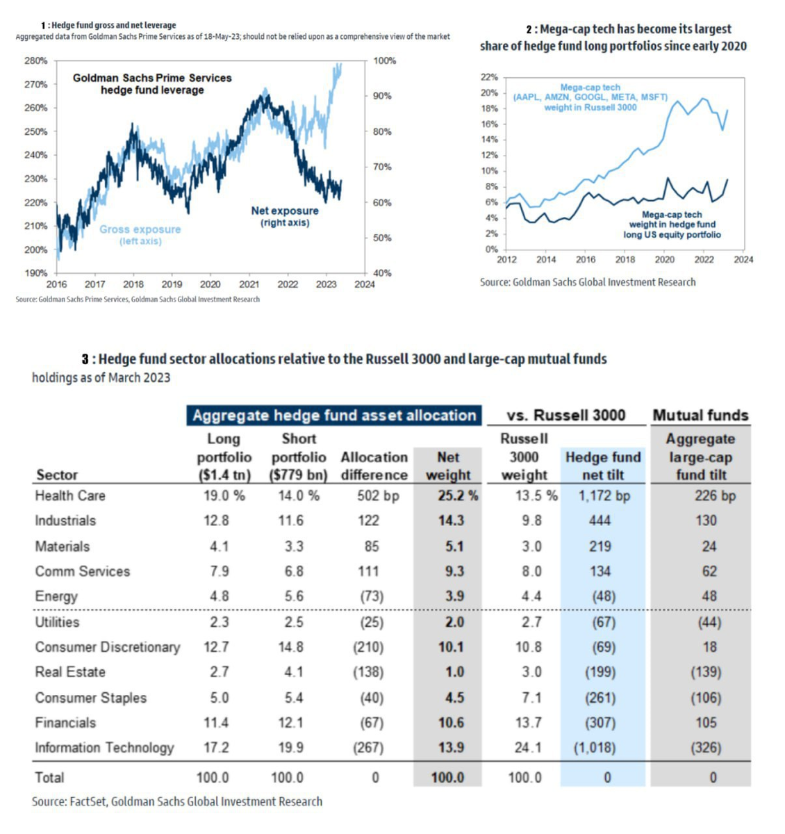 — Команда GS US Strategy опубликовала свой последний отчет Hedge Fund Trend Monitor, в котором проанализированы позиции 740 хедж-фондов с общим объемом акций в $2,2 трлн на начало 2 квартала 2023 года ($1,4 трлн длинных и $779 млрд коротких позиций).