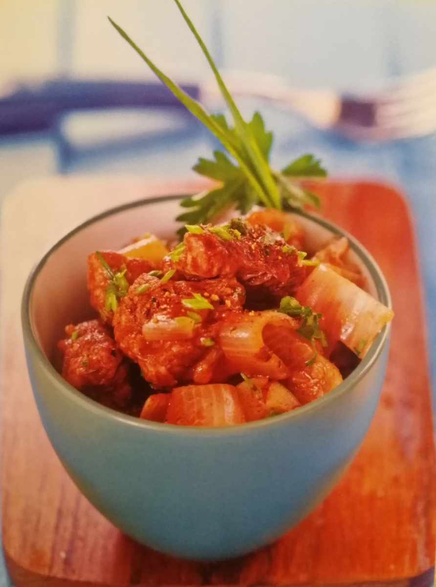 Для приготовления 4-порций телячьего жаркого потребуется: Мясо порежьте кубиками, посолите и поперчите, положите в чашу мультиварки. Подрумяньте его в течение 10 минут в режиме "Выпечка". Нарежьте лук, измельчите чеснок. Когда мясо подрумянится, добавьте бульон и травы. Готовьте в режиме "Тушение" 2 часа. Подавайте с томатным соусом, либо с томатной пастой. Приятного аппетита! 😊
