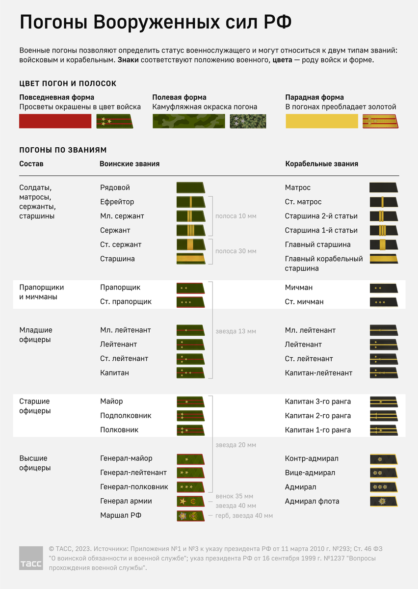 Военные погоны позволяют определить статус военнослужащего. Они могут относиться к двум типам званий: воинским и корабельным. Также с помощью цвета погон обозначается определенный род войск и тип формы.