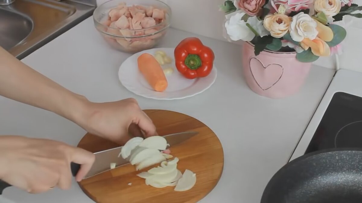 Вариантов приготовления быстрого ужина масса, и сегодня хочу поделиться как раз одним из них. Лапша с курицей по-азиатски каждый раз может быть разной. Например, ее можно готовить как с рисовой лапшой, так и с гречневой или с обычными спагетти. Овощи тоже из раза в раз могут отличаться. Стручковая фасоль, несколько видов болгарского перца, ростки сои, стрелы чеснока, морковь, лук, чеснок, кукуруза, горох — комбинируйте по своему вкусу и наличию в холодильнике. В конце статьи поделюсь, как сделать такую лапшу еще вкуснее! Подробный процесс приготовления можно посмотреть в следующем видео: А подписаться на мой канал Цветкова Наталья можно здесь! Давайте приготовим вместе: Куриное филе нарезаем небольшими кусочками. Если не нравится филе, можно использовать любую другую часть курицы. Лук режем тонкими полукольцами. Морковь и болгарский перец нарезаем соломкой. Если есть терка для моркови по-корейски, можно воспользоваться ей. Чеснок мелко рубим или пропускаем через пресс. В сковороде разо