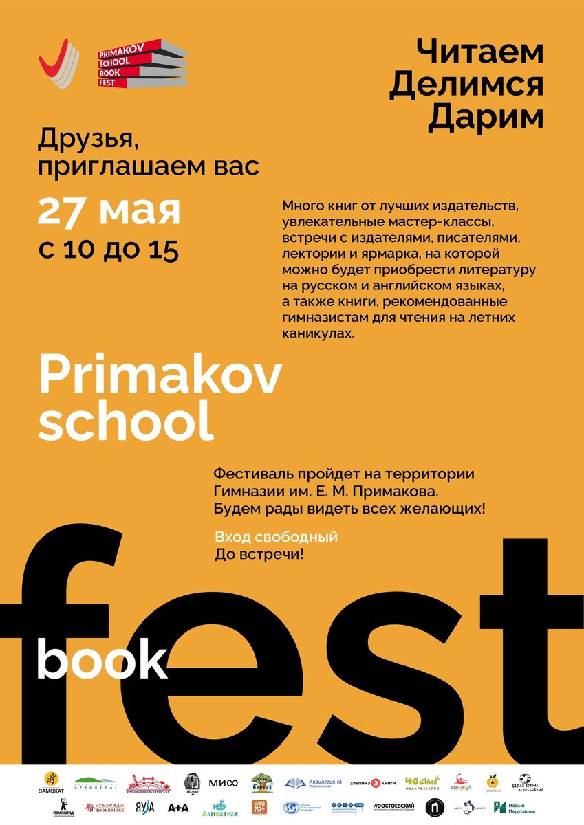 Уже в эту субботу, 27 мая, ждём вас на книжном фестивале Primakov School Book Fest! На ярмарке будут творческие мастер-классы, встречи с писателями, лекции от популяризаторов науки, психологов и педагогов, благотворительная книжная полка, литературное кафе и лотерея. В фестивале примут участие российские издательства и музеи. Вы сможете познакомиться с книжными новинками — литературой на русском и английском языках. И, конечно же, познакомиться с новинками и бестселлерами нашего издательства! Когда: 27 мая, с 10:00 до 15:00